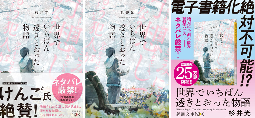 전자책화는 절대 불가능하다며 “종이책으로만 체험할 수 있는 감동”, “지금까지 읽은 책 중 가장 큰 충격”, “책 모양의 예술작품”, “무슨 말을 해도 스포일러가 되니까 대단하다고 밖에 말할 수 없다” 등 차례로 입소문이 나면서 서점가에 돌풍을 일으키고 있는 작품이다. 청춘소설을 주로 쓰던 스기이 히카루의 확장된 세계를 엿볼 수 있는 야심작. 미스터리 작가인 아버지의 별세 후 사생아인 ‘나’에게 연락이 온다. 죽기 직전에 썼다는 원고를 유작으로 출판하고 싶은데 찾을 수가 없다는 것. 조사를 하게 되면서 아버지의 복잡한 인물상을 알아가던 나는 「세상에서 가장 투명한 이야기」에 숨겨진 충격의 진실에 도달한다.